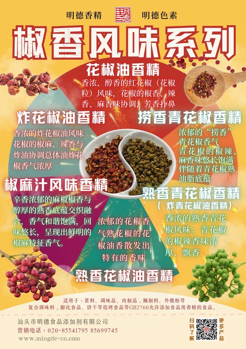 汕頭市明德食品添加劑有限公司的椒香風(fēng)味香精系列,涵蓋花椒、炸花椒、搗香青花椒、椒麻汁風(fēng)味、熟香青花椒及熟香花椒等多種類型。產(chǎn)品具有真實(shí)的椒香、麻香、辣香及油脂香特征,適用于醬料、調(diào)味品、肉制品、腌制料及復(fù)合調(diào)味料等B端應(yīng)用,助力工廠快速打造風(fēng)味豐富、層次鮮明的椒香產(chǎn)品。